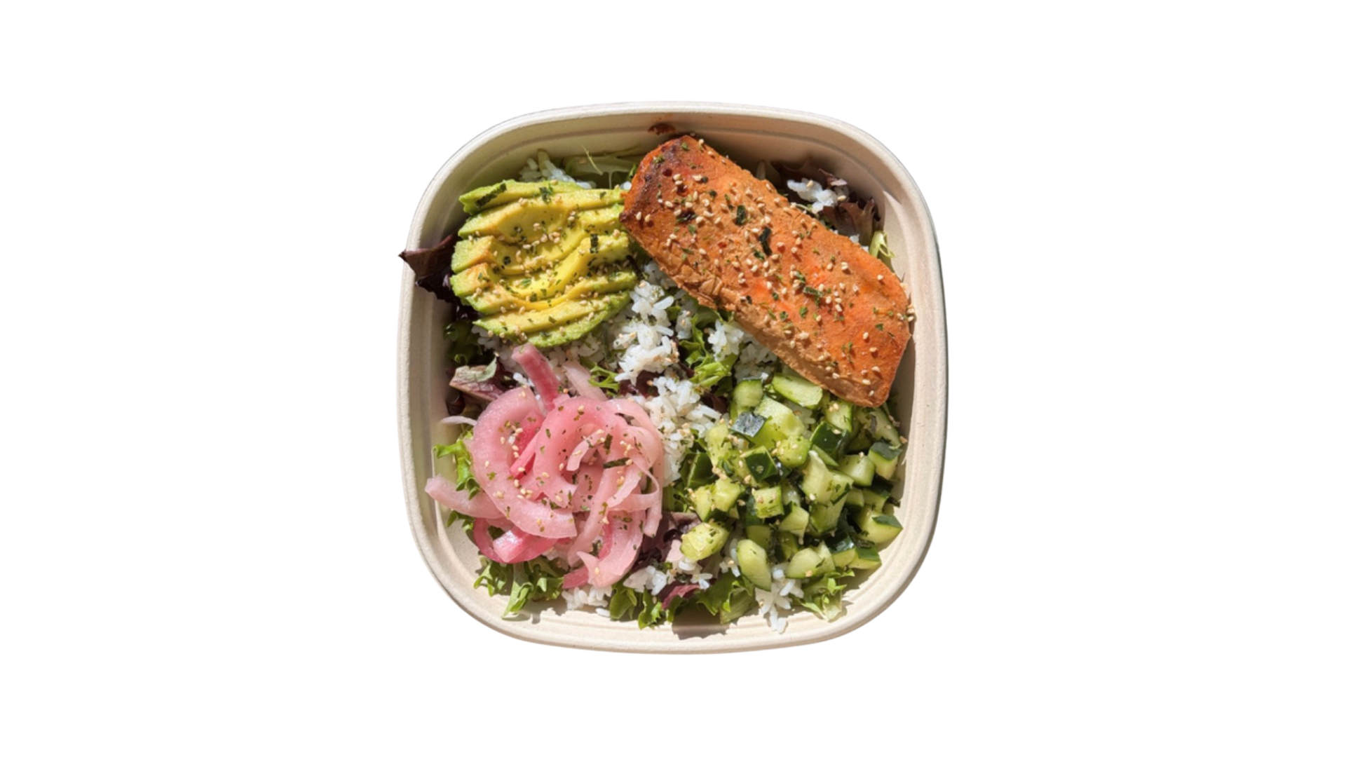 Mesclun, Sushi Rice, Miso-Glazed Salmon, Avocado, Pickled Red Onions, Cucumbers, Furikake (Nori Flakes + Sesame Seeds), Spicy Sriracha Dressing