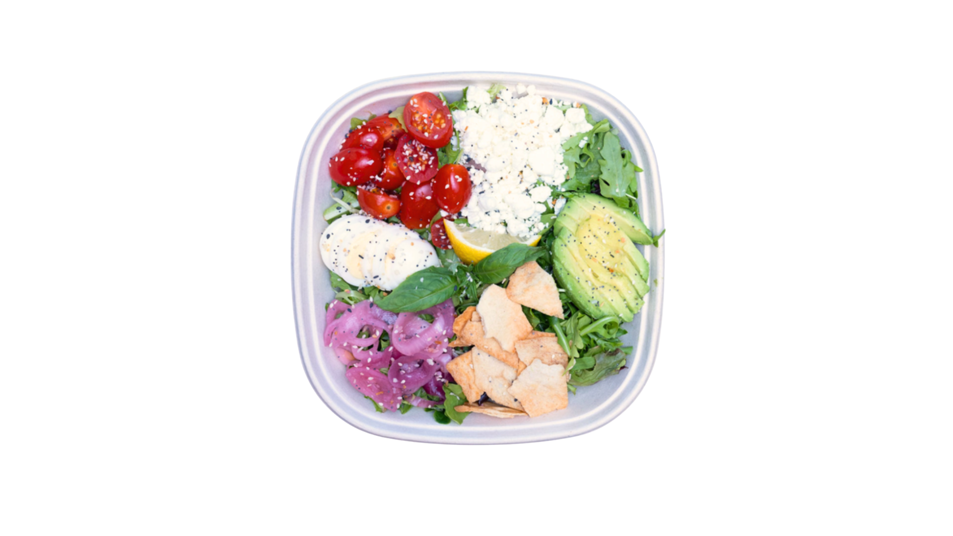 Romaine, Mesclun, Avocado, Goat Cheese, Hard Boiled Egg, Pita Chips, Grape Tomatoes, Pickled Red Onions, Basil, Lemon Tahini Dressing